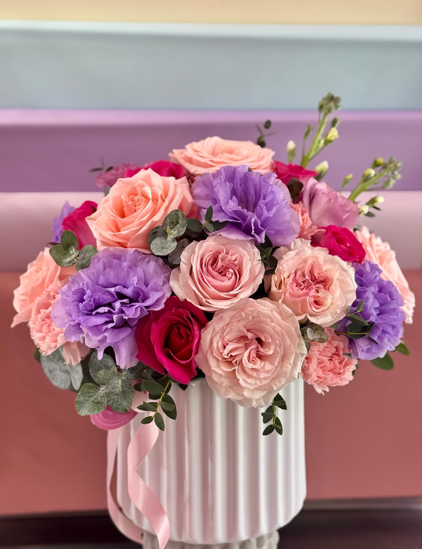 Arreglo en base de ceramica con rosas, licianthus, clavel y follajes mixtos en tonos rosas y lilas.