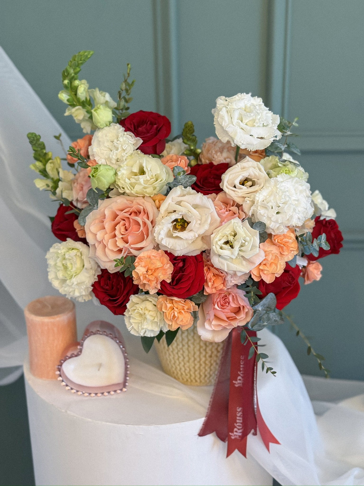 Base de cerámica con rosas, licianthus, perritos, claveles y follajes.